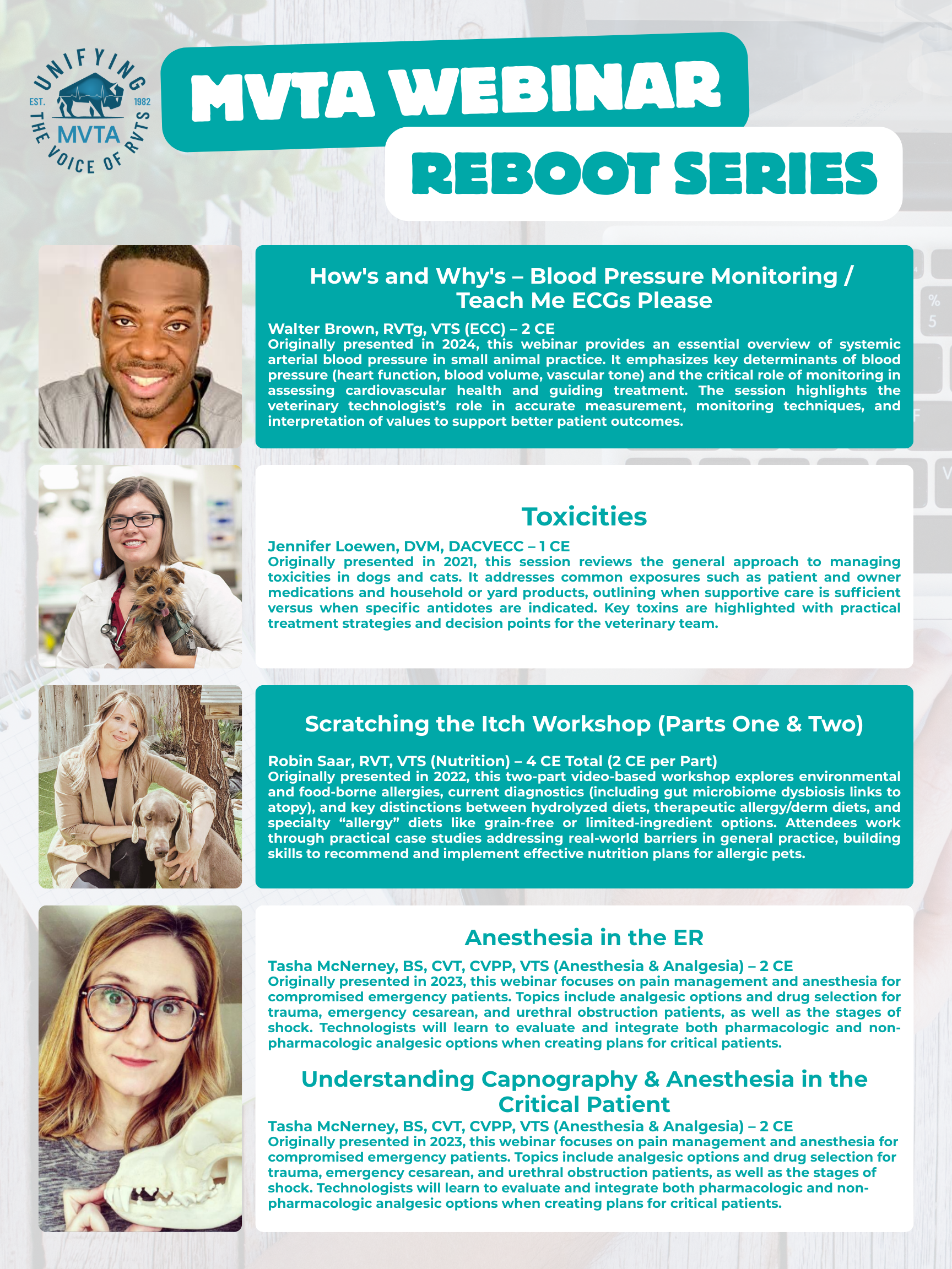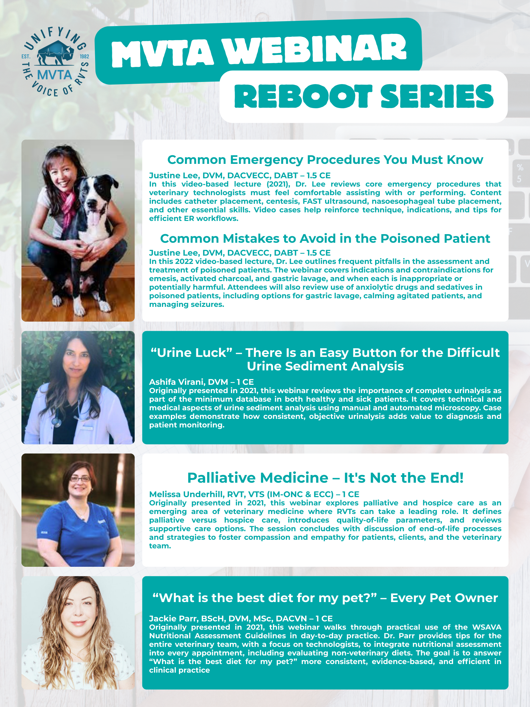 The MVTA is excited to be launching our refreshed Webinar Reboot Series: on-demand access to 11 of our most popular CE sessions (17 hours total, 8 expert speakers) to help you meet the MVMA's May 31, 2026 CE deadline.
